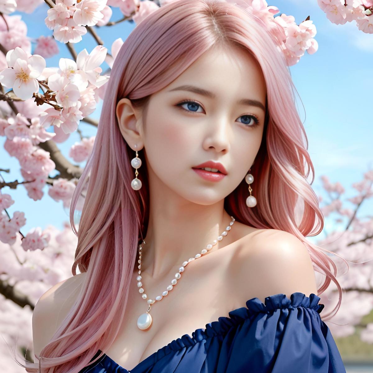 1girl,artist_name,bare_shoulders,blue_eyes,cherry_blossoms,earrings,hair_ornament,jewelry,lips,long_hair,looking_at_viewer,necklace,off_shoulder,pearl_necklace,pendant,petals,pink_hair,realistic,solo,upper_body