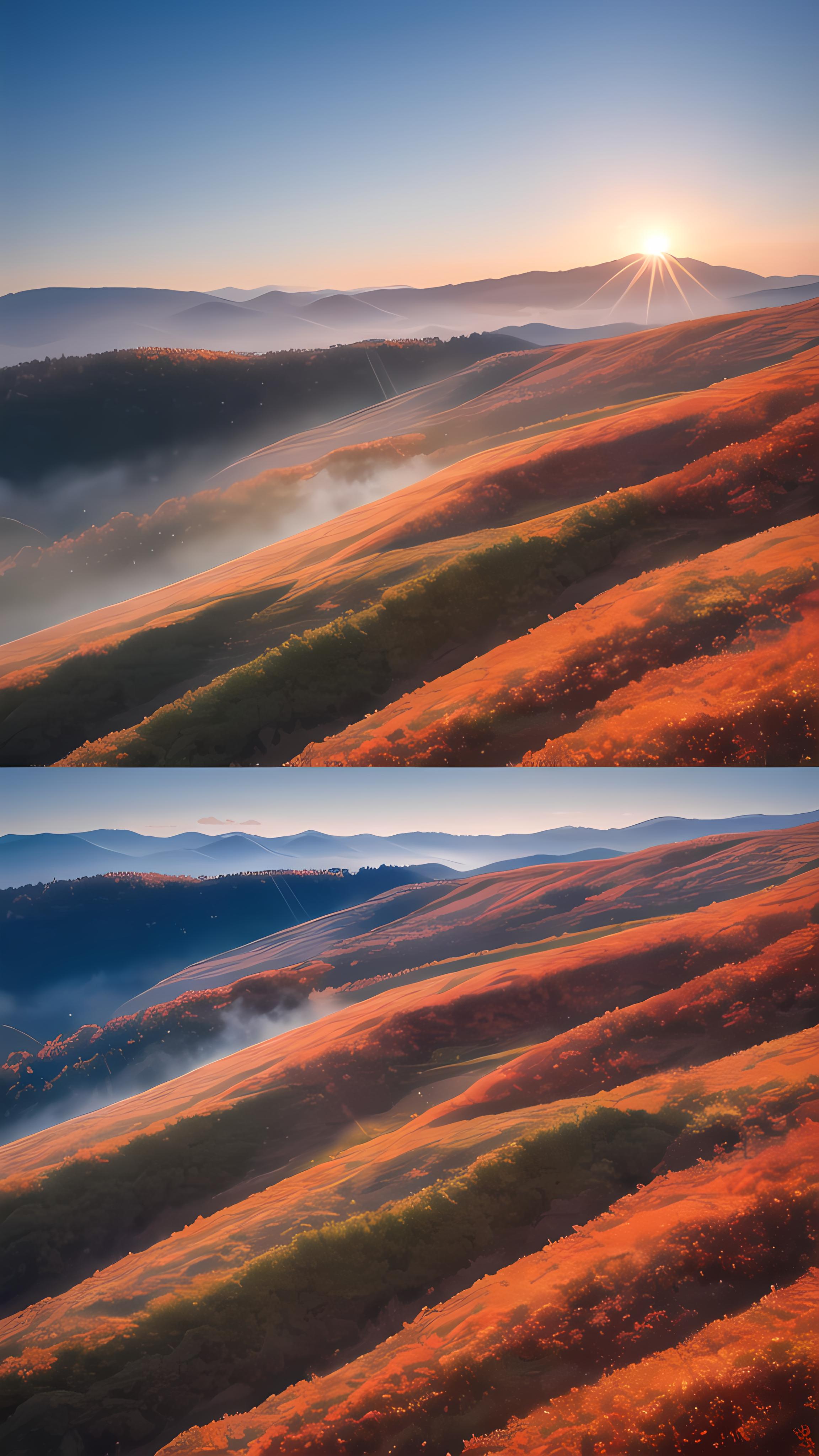 Autumn scenery, picturesque, warm colors, golden leaves, falling leaves, autumnal, serene, peaceful, distant view, trees, countryside, mountains, harvest, misty, foggy, sunrise, sunset, (landscape), (nature), (outdoor), (panorama), (horizon), (season), (idyllic), (vibrant), (rustic), (leaf-strewn), (crisp air), (maple tree), (breathtaking), (tranquil), (hillside), (meadow), (woods), (orange and red hues), (rural), (flaming foliage), (clear blue sky)
