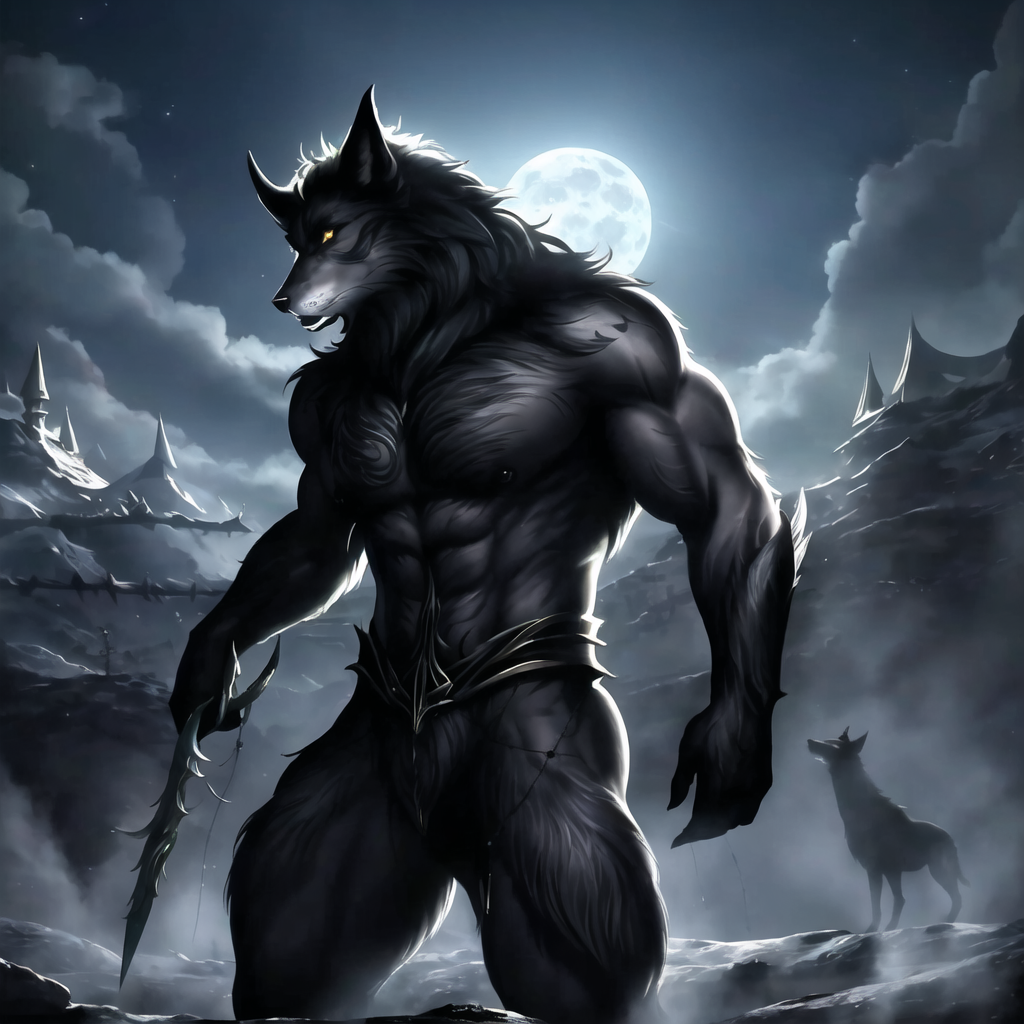 Dark fantasy, high-quality resolution, fierce, intimidating, werewolf, transformation, full moon, night sky, glowing eyes, sharp claws, muscular physique, fur texture in high definition, snarling expression, (savage), (mysterious), (intriguing), (mythical creature), (horror), standing on hind legs, barren landscape, (moonlight), (intense shadows), (symbolic imagery), (ominous), (enigmatic), (symbolic tattoo), (restrained fury).