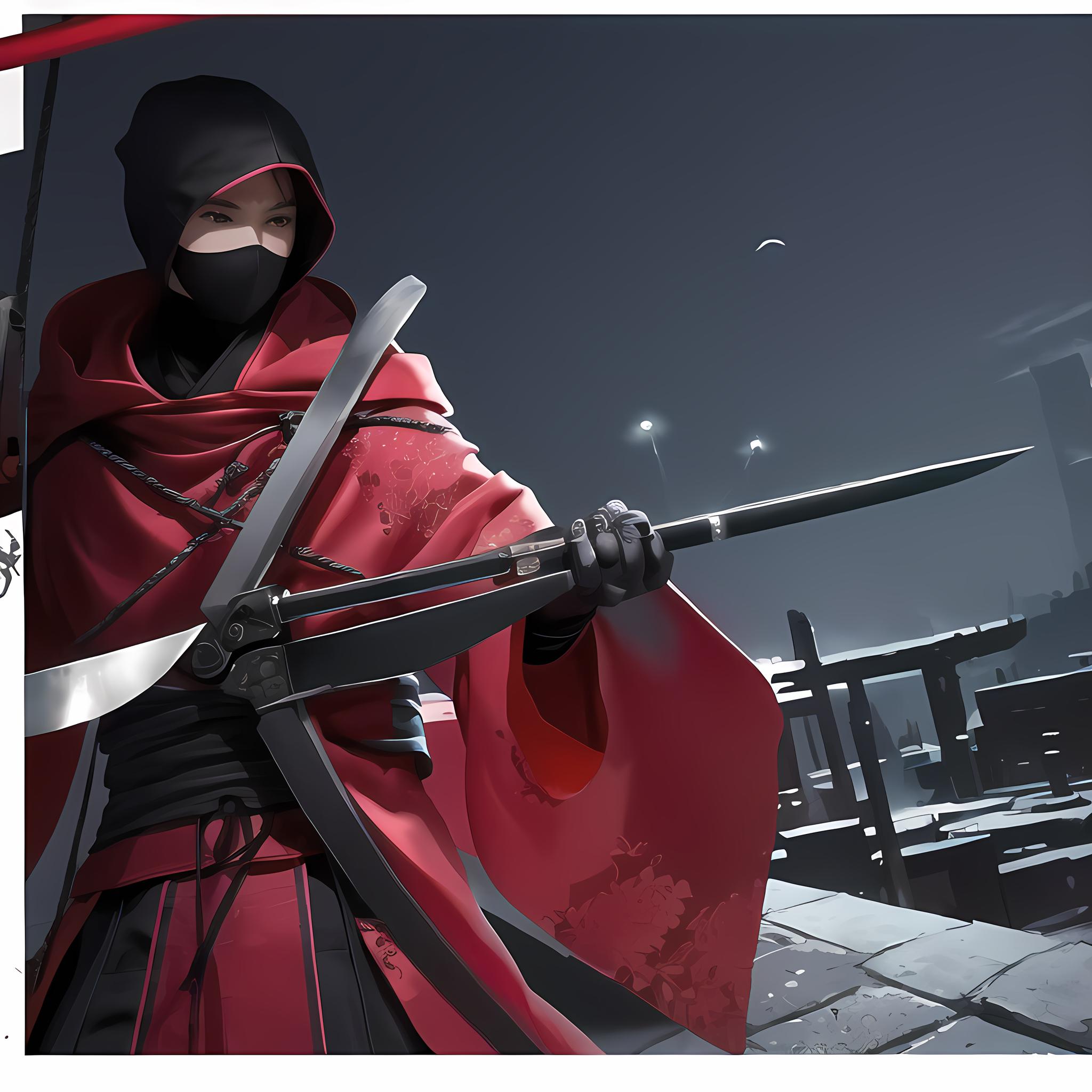一副完整的日本忍者服,面罩笼罩下的眼睛,(黑色头巾),(披着红色斗篷),隐蔽在夜晚的街道上,手持(千姿百态的忍具) 如苍蝇拍,飞镖,手里剑,刀等,紧贴着暗色的墙壁,(镜头近距离),夜色下仅有的灯光照亮身影,向目标悄悄接近,(现代风格的插画)展现出生动的场景,(废墟/ 垃圾倾泻的城市背景)构成一个神秘而危险的环境,(没有任何声音),(微冷的夜色)以及(汗水的气味)都能感受到,而身上的忍者服则呈现出暗色系,用(阴影和高光)描绘出轮廓和细节,呈现出极致的逼真感和动感!