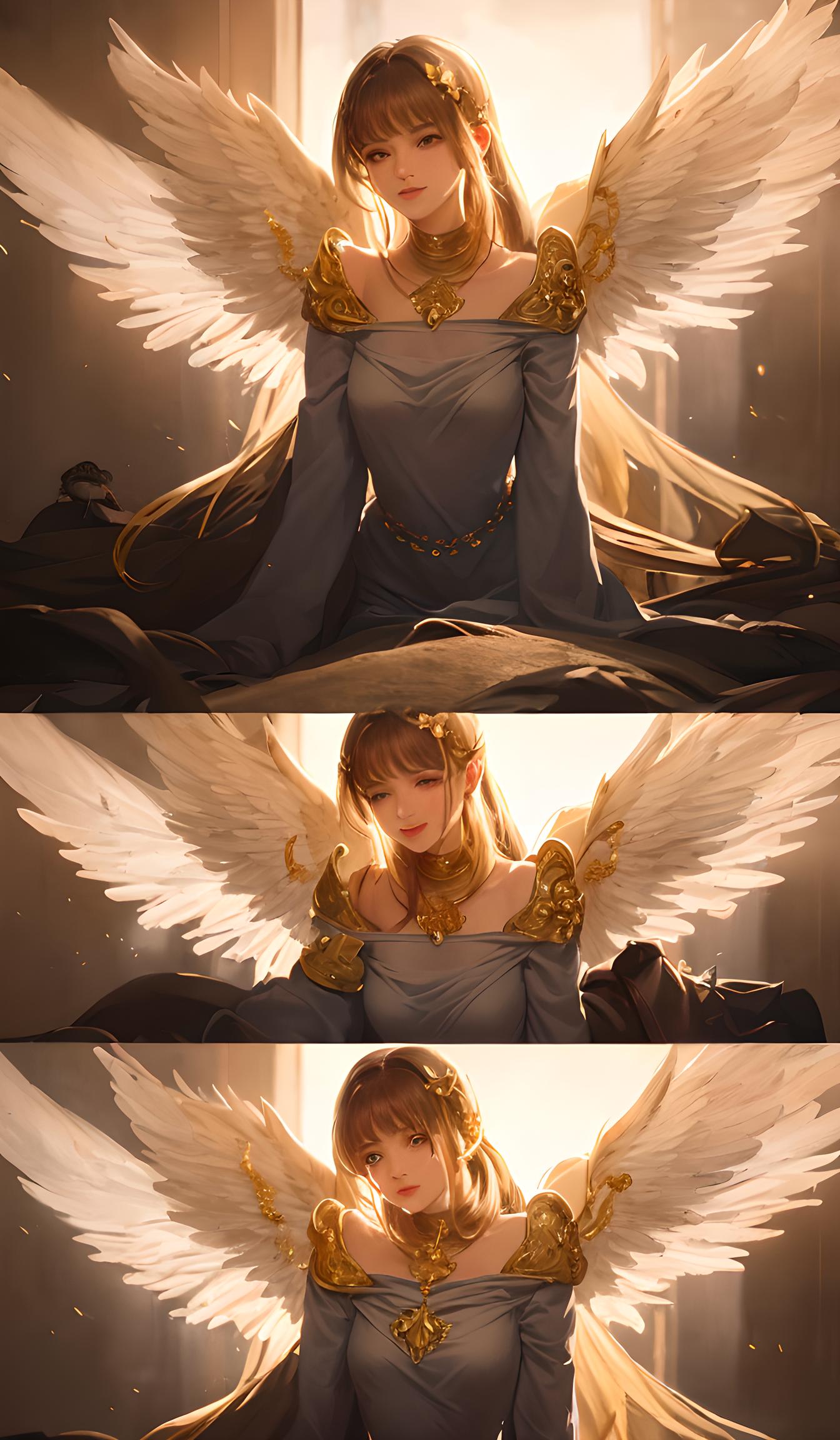 一位华丽的天使,(近景),金色光芒,优雅的姿势,迷人的微笑,(壮丽的翅膀),暖色调,(风景绘画艺术风格),(复古的装饰),背景求雨,(古典气氛),柔和的灯光,(对比强烈的阴影),极致细节,(充满神秘感的神话故事),紧张的情感表达。