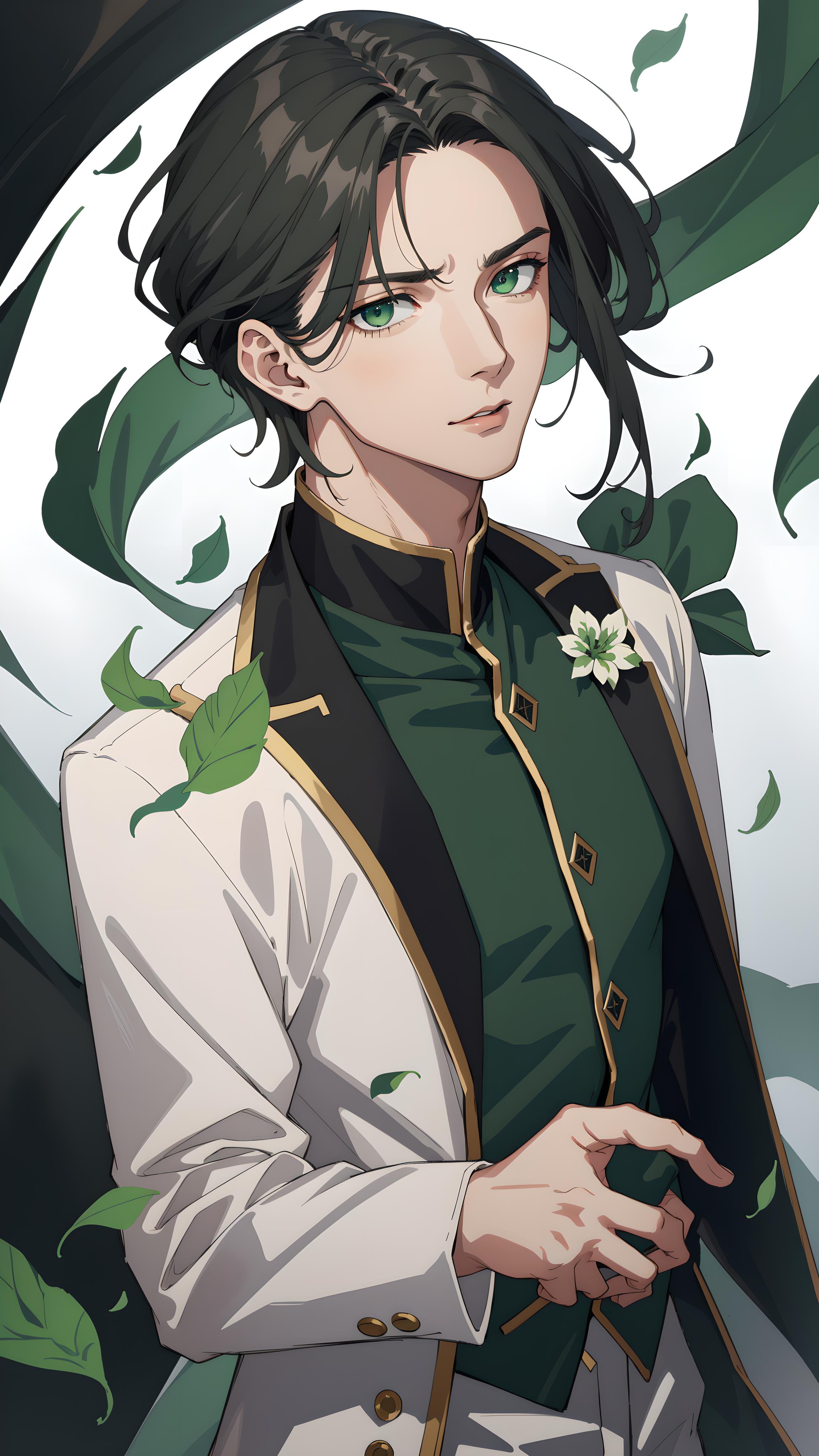 ((masterpiece)), extremely high quality artwork, masterwork, incredibly absurdres, ((best quality)), (ultra-detailed), (beautiful detailed eyes), detailed light, dynamic angle, depth of field, dynamic light, ((1boy)), male, detailed eyes, detailed face, ((dark grey hair)), ((vivid green eyes)), smooth hair, (((medium hair))), parted bangs, handsome, dynamic expression, dynamic pose, blowing wind, (green magic aura), green energy, battle uniform, imposing gaze, battle, ((green petals)), upper body, dynamic angle, facing left
