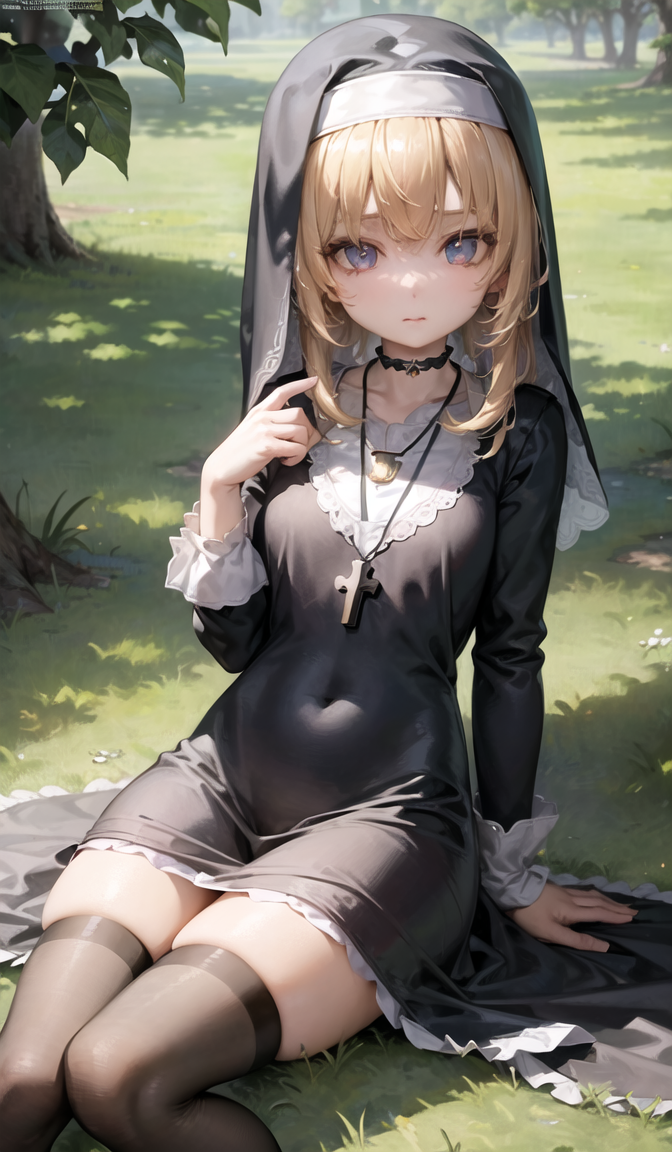 (watercolor pencil),1girl,((masterpiece)),((best quality)),((official art)),(extremely detailed CG unity 8k wallpaper), game_cg, huge_filesize, wallpaper, personification, short hair, blonde hair, (short hair with long locks), hair flower, cute face, naughty_face, blue eyes, (medium breasts), yellow robe, white thighhighs,(looking at viewer), narrowed eyes,pendant, jewelry, black choker , nun