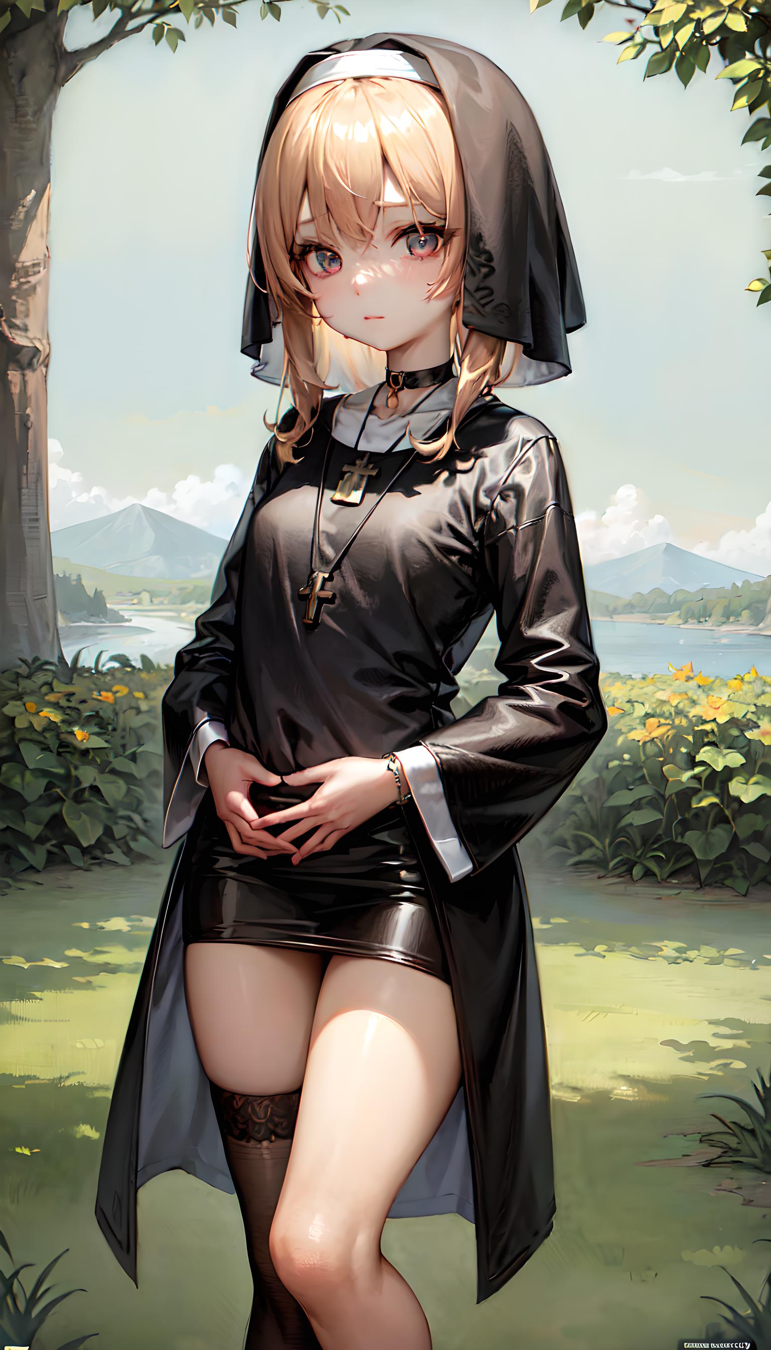 (watercolor pencil),1girl,((masterpiece)),((best quality)),((official art)),(extremely detailed CG unity 8k wallpaper), game_cg, huge_filesize, wallpaper, personification, short hair, blonde hair, (short hair with long locks), hair flower, cute face, naughty_face, blue eyes, (medium breasts), yellow robe, white thighhighs,(looking at viewer), narrowed eyes,pendant, jewelry, black choker , nun