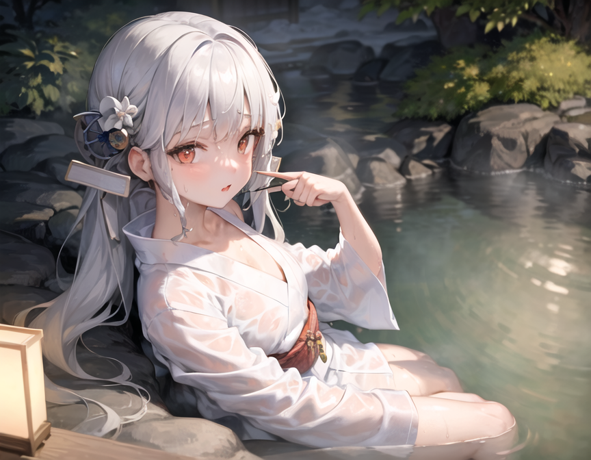 (((masterpiece))), (best quality), (highly detailed),(extremely detailed CG unity 8k wallpaper), (illustration),1girl,solo,wet, (partially submerged:1.55),(onsen:1.5),(white yukata:1.45),snow, ice, glowing eyes, Seductive face,in winter,steam,(upper body),high close up, highly detailed, center frame, sharp focus, looking at viewer, (sunlight), river, (forest),(painting),