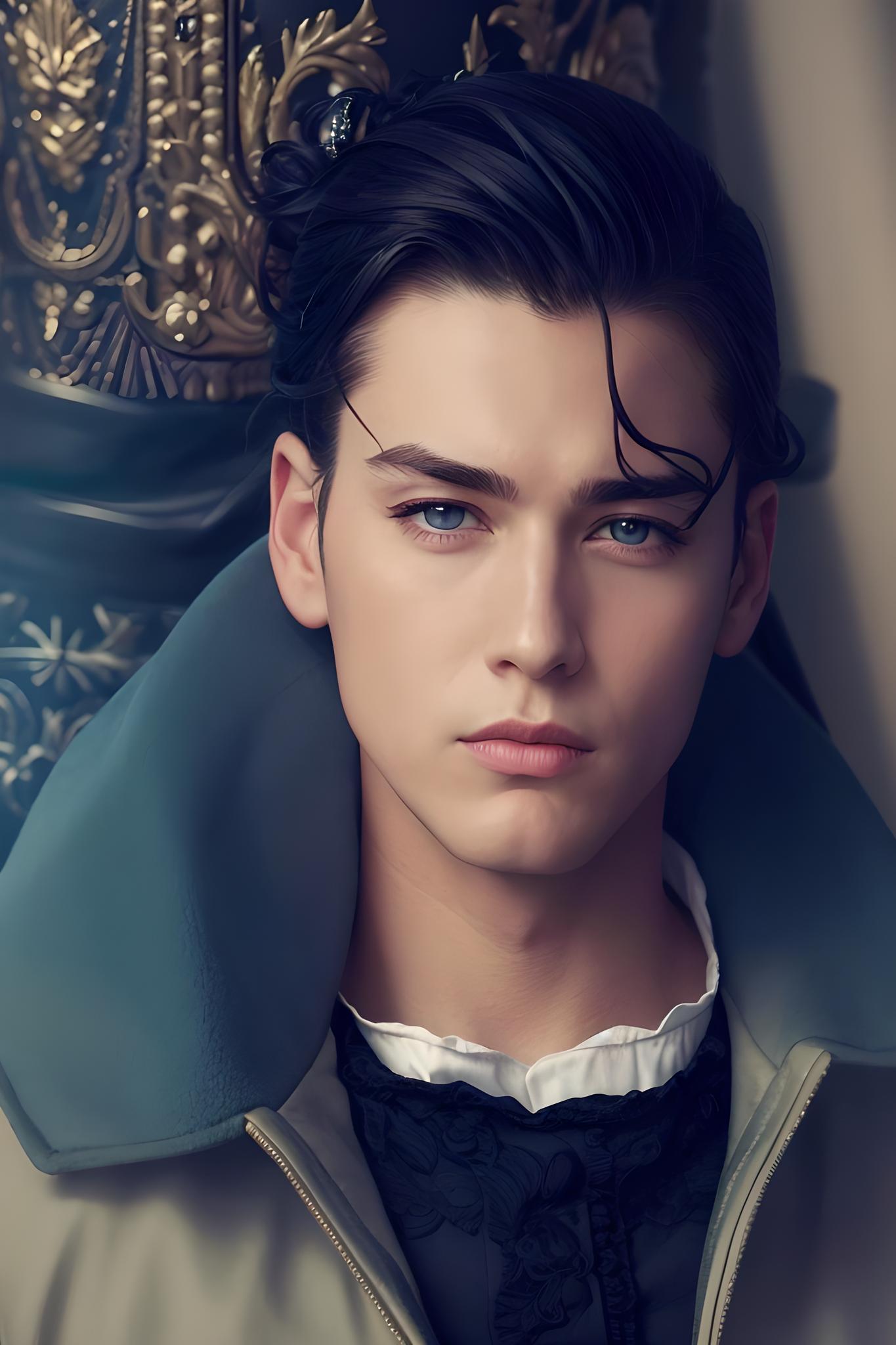 black_hair,blue_eyes,closed_mouth,crown,face,forehead,hair_pulled_back,hair_slicked_back,lips,looking_at_viewer,portrait,realistic,solo