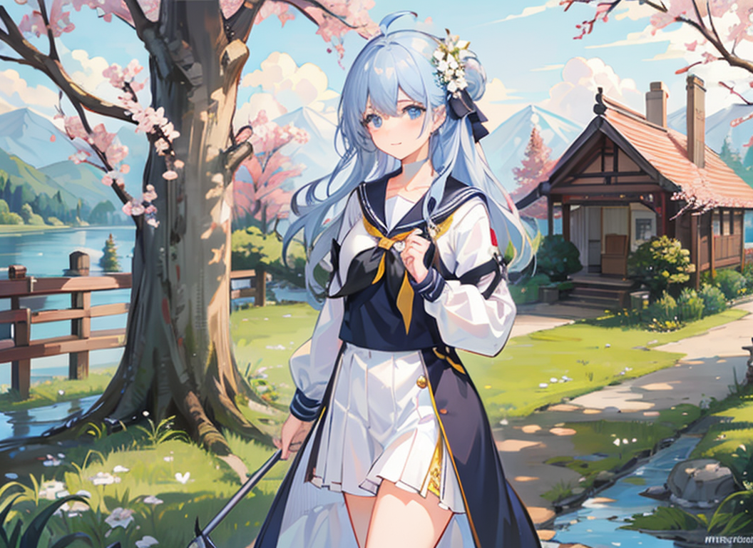 1girl,ahoge,architecture,bangs,bare_tree,blue_eyes,blue_hair,blue_sailor_collar,blue_sky,branch,bridge,building,bush,cherry_blossoms,closed_mouth,cloud,cloudy_sky,collarbone,day,east_asian_architecture,flower,garden,grass,grey_eyes,hair_between_eyes,hair_flower,hair_ornament,holding,holding_flower,house,lake,long_hair,long_sleeves,looking_at_viewer,mountain,outdoors,path,petals,pink_flower,pond,river,road,sailor_collar,skirt,sky,smile,solo,spring_(season),standing,tree,very_long_hair,white_flower