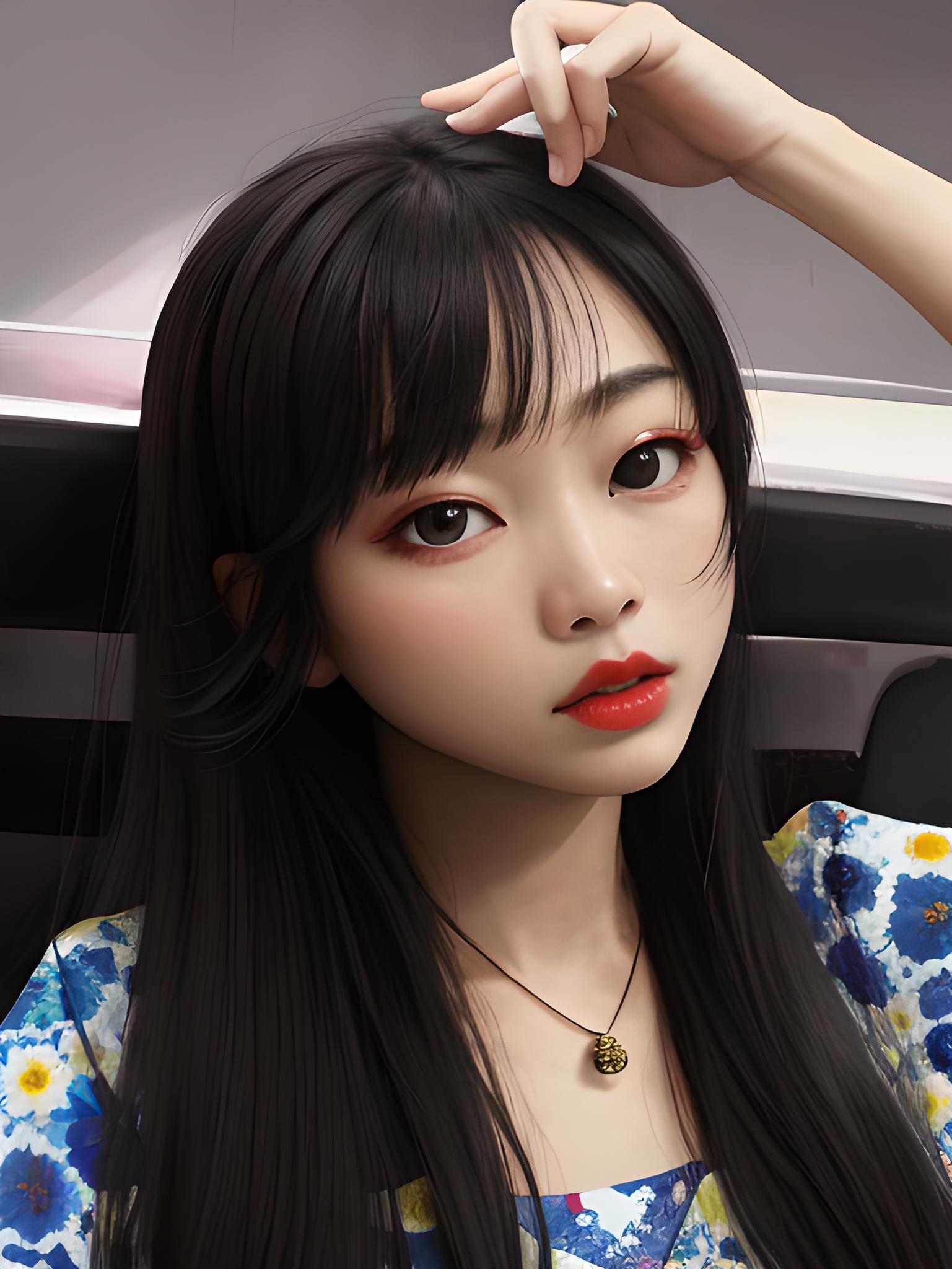 1girl,arm_up,asian,black_eyes,black_hair,blue_flower,bouquet,floral_print,flower,hand_on_own_head,hands_on_own_head,jewelry,lips,long_hair,looking_at_viewer,necklace,nose,photo_(medium),realistic,red_lips,salute,solo,swept_bangs,white_flower